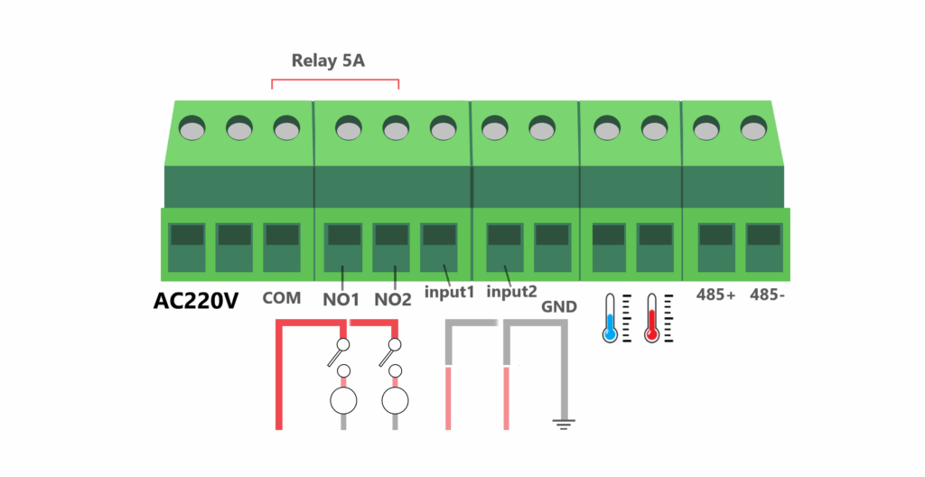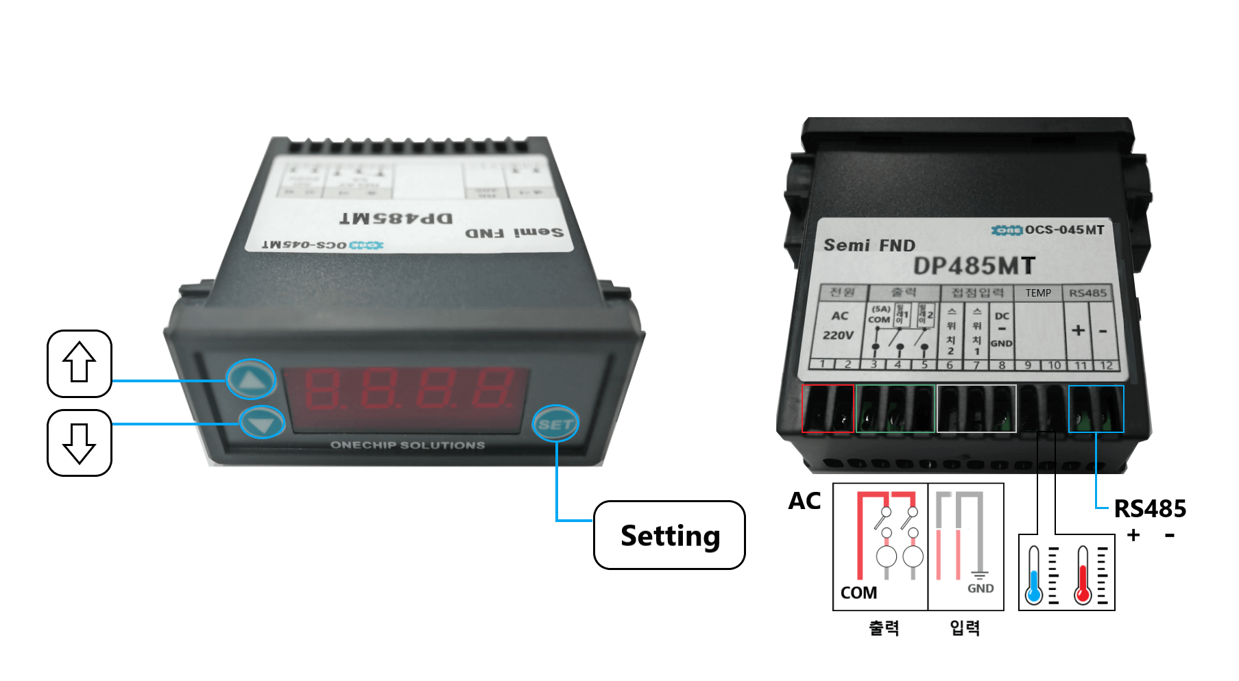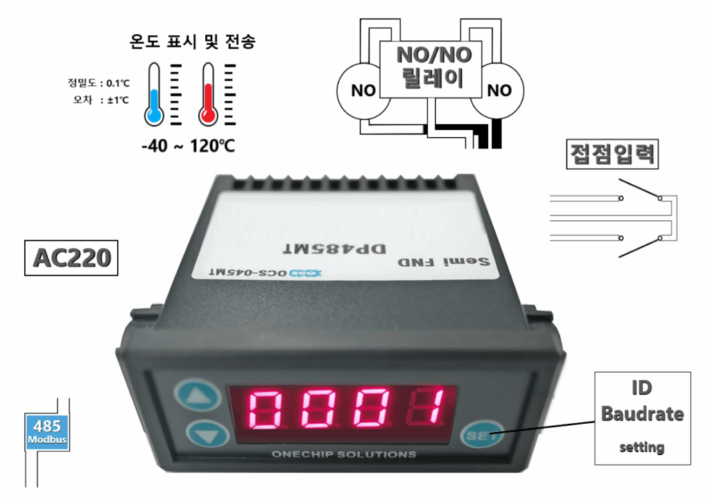 DP485MT(Display Panel)모델은 DP485M에 온도센싱을 추가한 모델로 RS485 시리얼 통신을 통해 4자리 FND모듈에 숫자 및 문자를 표시할수 있고 온도값을 전송 및 표시할 수 있도록 개발된 제품입니다. DP485는 Blink, 도토 표기, Hex표기 등의 다양한 기능을 내장하고 있으며, 각 자리에 Ascii코드를 전송함으로서 해당문자를 쉽게 표시할 수 있는 장점도 지니고 있습니다. DP485M은 디스플레이 기능뿐만 아니라 스위치입력 5점(접점입력 2점포함)을 호스트로 전송할수 있어서 로컬에서 값을 설정하거나 변경하는 기능을 수행할수 있는 특징이 있으며, 더불어 릴레이 출력이 2점(NO)이 내장되어 간단한 리모트 I/O 기능을 수행할수 있습니다. 통신 프로토콜은 Modbus RTU 방식으로 설계되었습니다.